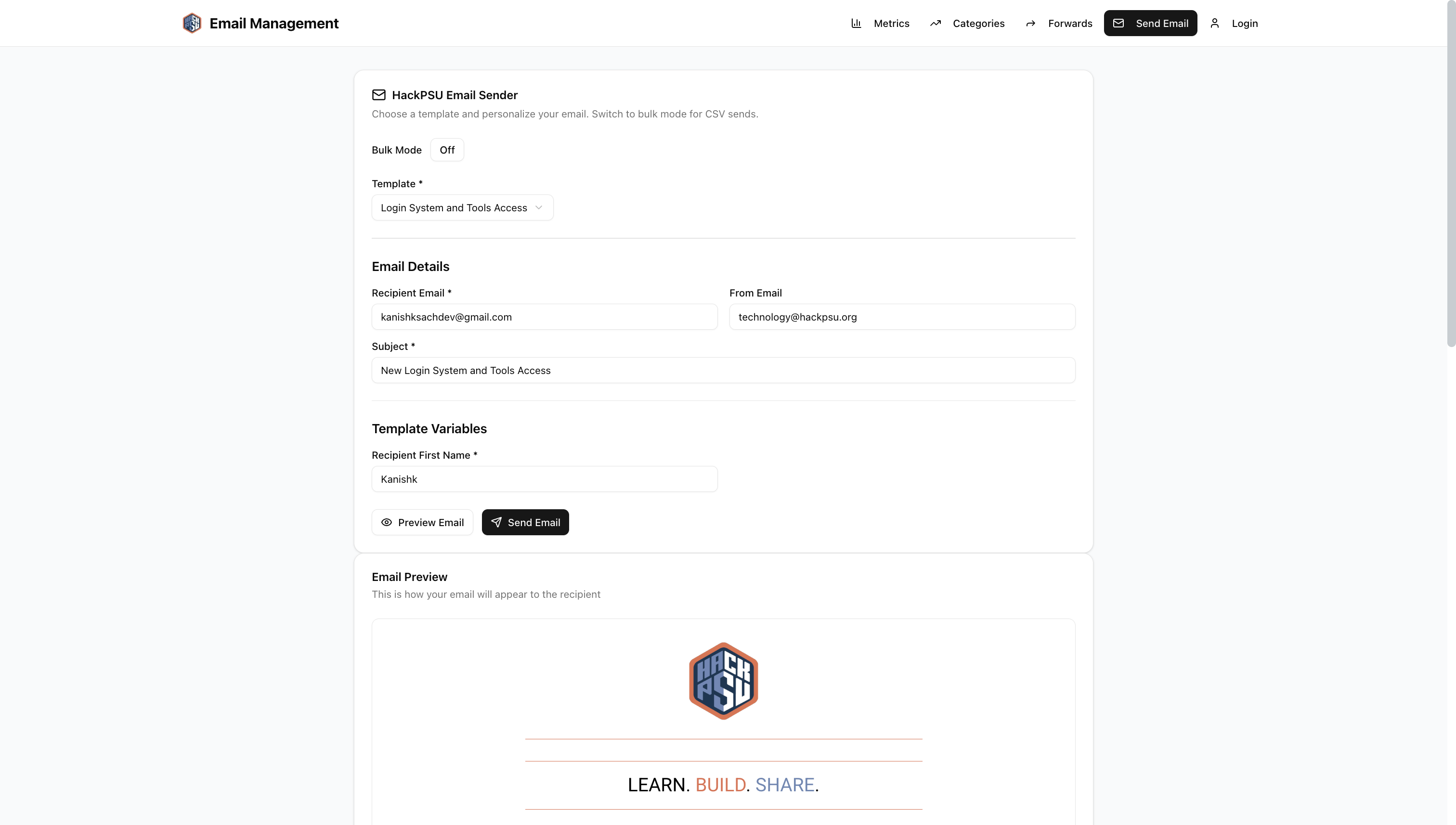 HackPSU already had a working authentication system a bulk email feature needed to slot in without a full rewrite. Organizers had to upload HTML templates manually test them locally and copy‑paste to SendGrid UI, or write their own scripts. That led to broken layouts missing personalization fields and no easy way to retry failed sends.