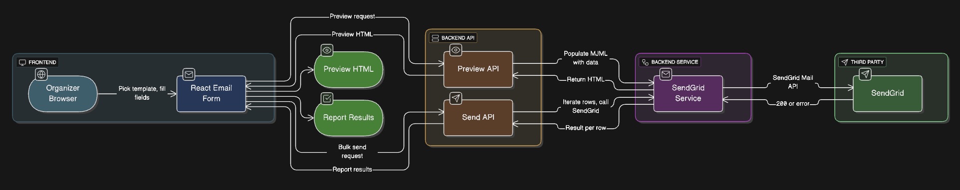 I built a React form for single and bulk templated email with live preview, backed by NestJS endpoints that fetch MJML templates from Firebase Storage, compile them with Handlebars and send via SendGrid. The system slots into our existing apps, keeps templates in one place, gives organizers clear feedback and paves the way for robust retry and analytics in the future.