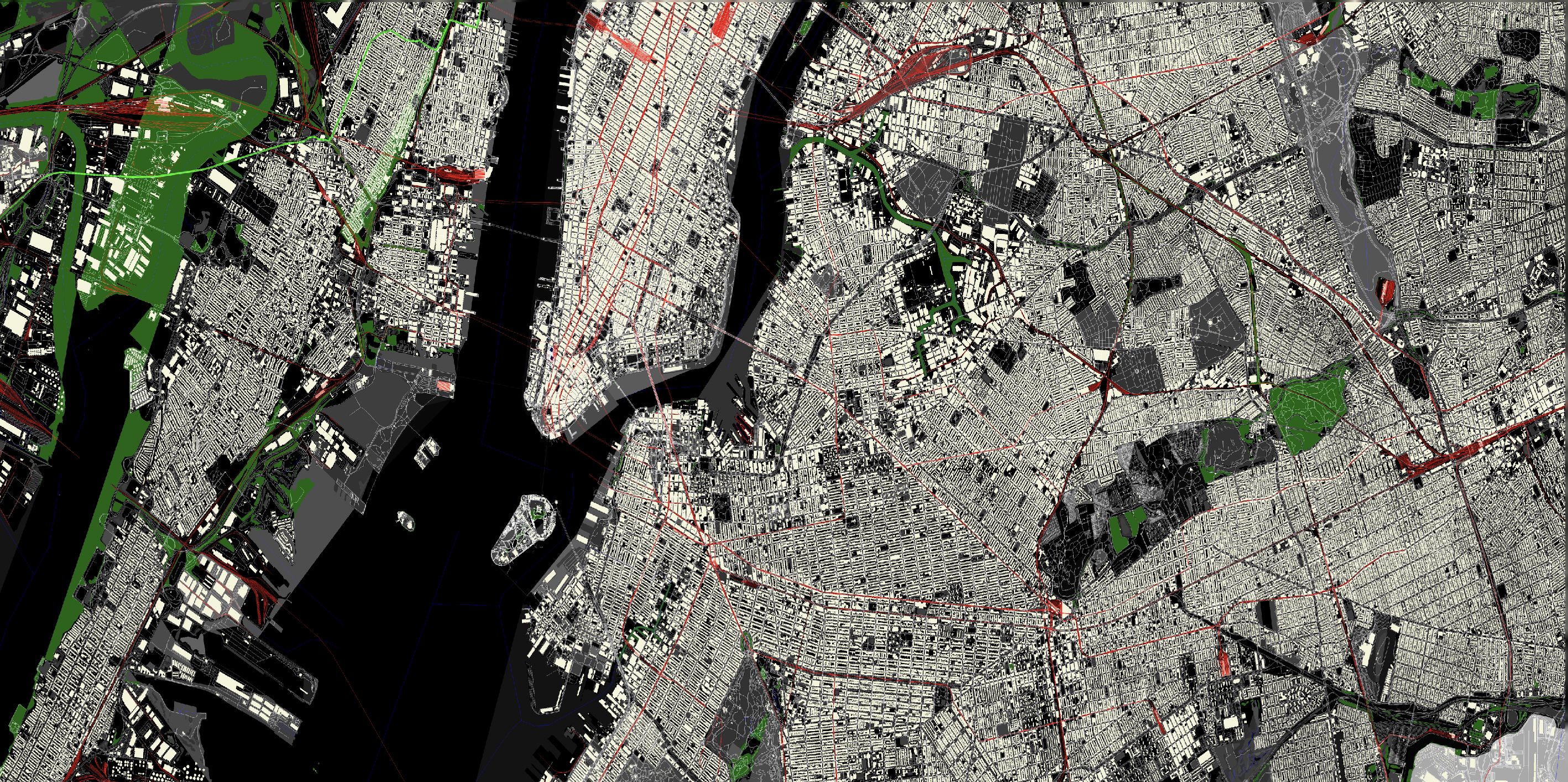 Few blocks in Manhattan with roadways and railways rendered.